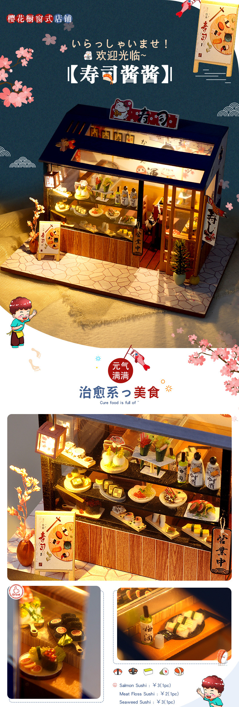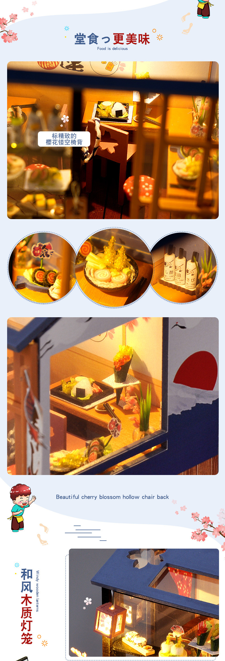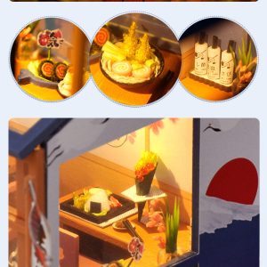 - Thiết kế chân thực: Mô hình nhà hàng sushi với các chi tiết nhỏ như đồ ăn, bàn ghế, và đèn lồng được tái hiện tinh xảo.